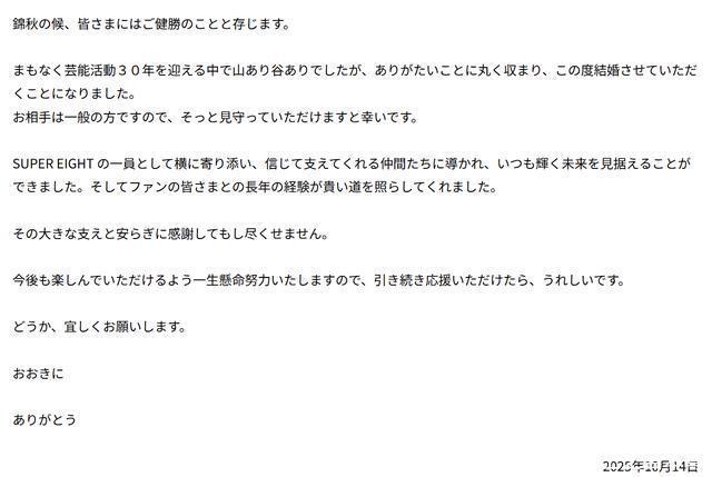 村上はサイトに掲載した文面の中で「まもなく芸能活動30年を迎える中で山あり谷ありでしたが、ありがたいことに丸く収まり、この度結婚させていただくことになりました」と発表。「SUPEREIGHTの一員として横に寄り添い、信じて支えてくれる仲間たちに導かれ、いつも輝く未来を見据えることができました。そしてファンの皆さまとの長年の経験が貴い道を照らしてくれました」「その大きな支えと安らぎに感謝してもし尽くせません」とSUPEREIGHTのメンバーやファンへの感謝を延べている。 村上在官网中写道:“我即将迎来演艺生涯30周年,这一路跌宕起伏,但所幸最终一切圆满,这次向大家报告,我结婚了”。他表示:“作为SUPEREIGHT的一员,在并肩同行、彼此信赖的伙伴们的引领下,我始终都能展望一个光芒的未来。而与粉丝朋友们多年来的宝贵经历,也照亮了我前行的道路。”“这份巨大的支持与温暖,我感激不尽”,字里行间都是对SUPEREIGHT成员和粉丝们的感谢。