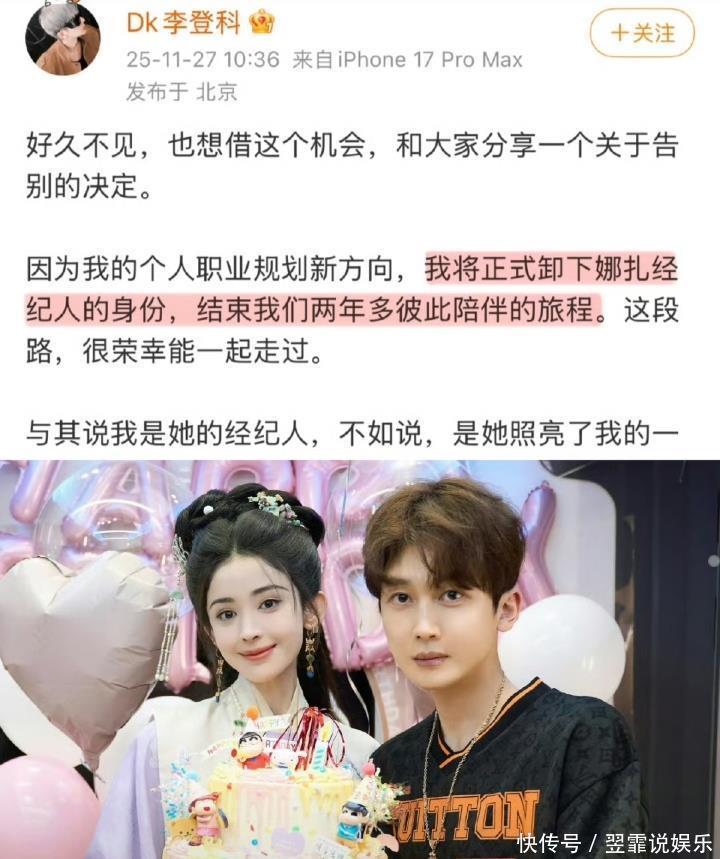 李登科在声明中明确卸任源于“个人职业规划新方向”,未来将转型自媒体IP创作,把行业经验转化为个人内容输出,直言“要做自己的经纪人”。他还深情赞娜扎是“职业路上的一束光”,体面告别获网友点赞。