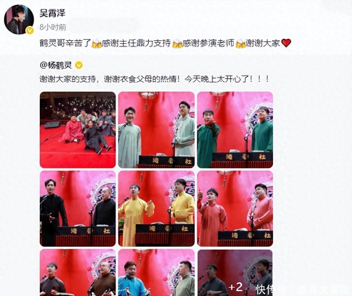 四队与鼓曲社联动,是因为杨鹤灵、吴霄泽小剧场专场有一个节目需要鼓曲社琴师的伴奏。既然演出有人家,演出后的庆功宴自然要发出邀请了。德云社是一个大家庭,相声、鼓曲虽然是不同的曲艺种类,但演员是在同一个单位。简单一点说,他们之间的联动,如同单位各部门之间的合作一样。之后的日子,会更加频繁,更加深入。